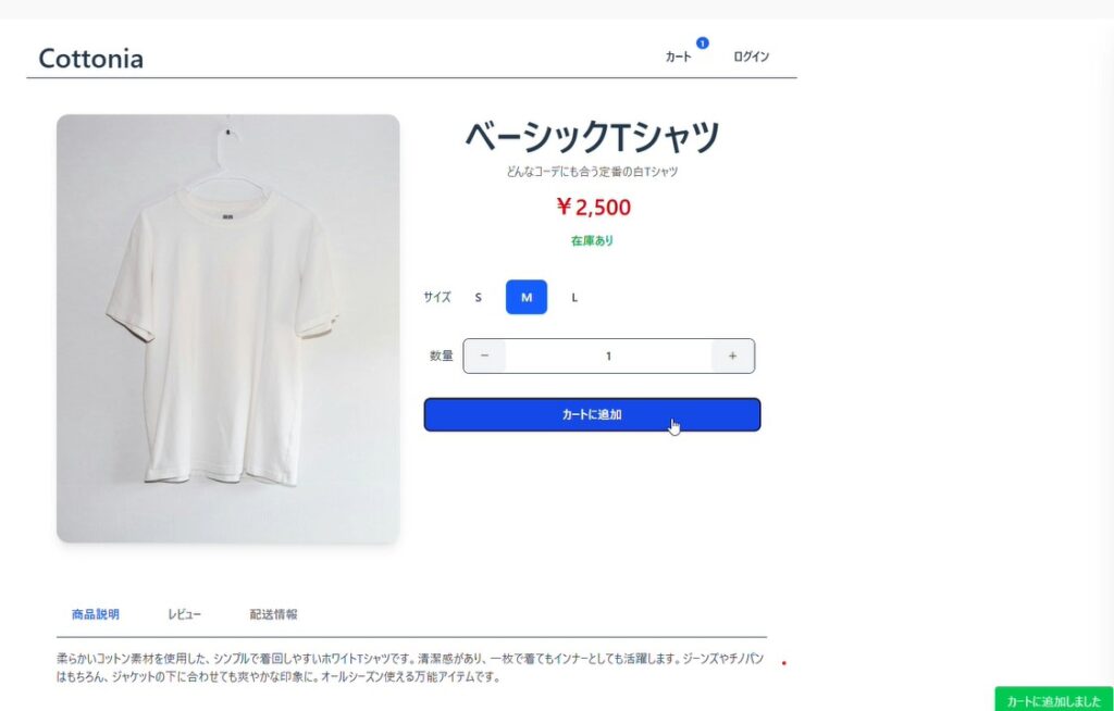 サイズ、数量を選択して「カートに追加」ボタンをクリックするとカートパネルにアイテムが追加されます。このとき、右下に「カートに追加しました」というスナックバーが表示され、「カート」の右上にアイテム総数を表すアイコンがつきます。