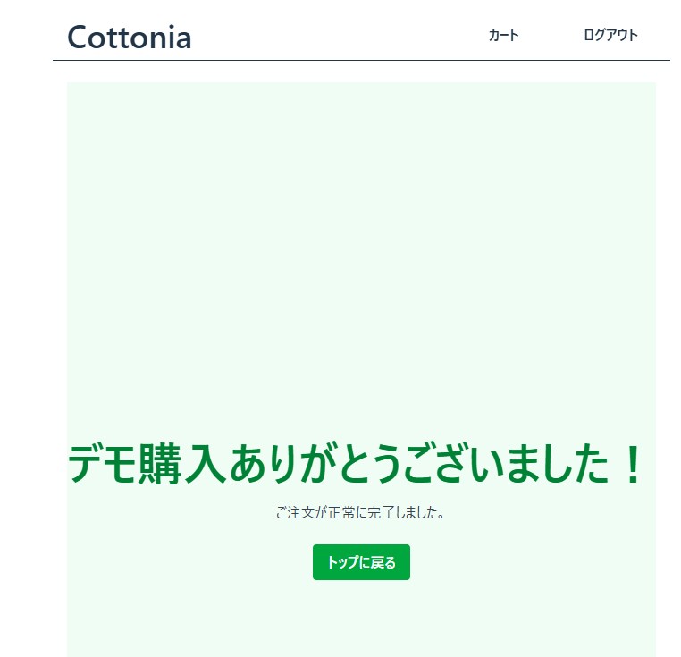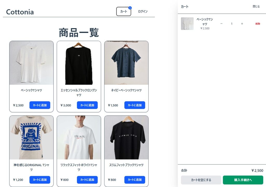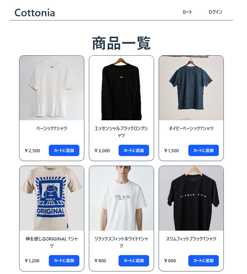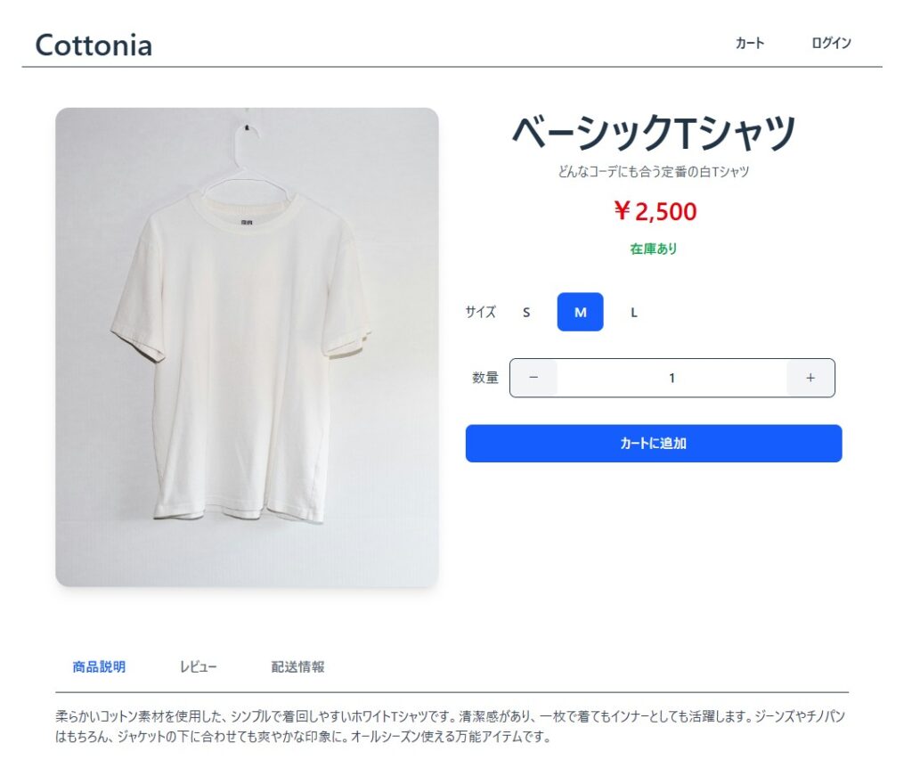 「Cottonia」は、シンプルで直感的に操作できるECサイトです。ユーザーが商品を選び、カートに追加し、購入まで完結できる仕組みを備えています。フロントエンドとバックエンドを完全に分離したSPA構成を採用しており、快適な操作性を実現しています。