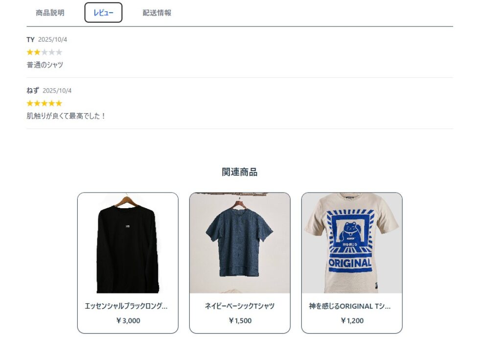 詳細ページでは商品説明、レビュー、配送情報などを確認することができます。これらは該当のタブをクリックすることで見ることができます。また、詳細ページでは選択した商品に適した関連商品も確認することができます